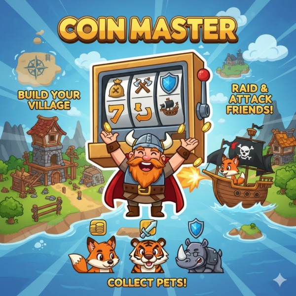 Coin Master blends luck and strategy. You spin a slot machine to get coins, attacks, raids, or shields. Use coins to build villages – there are hundreds of levels. Raid friends to steal their loot, or attack to damage buildings. Pets like Foxy, Tiger, and Rhino help with bonuses.
