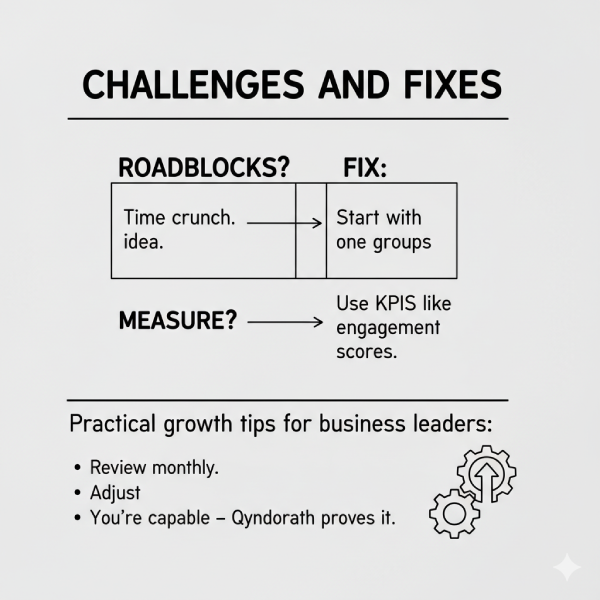 Roadblocks? Time crunch. Fix: Start with one idea. Doubt? Share wins in groups. Measure? Use KPIs like engagement scores.