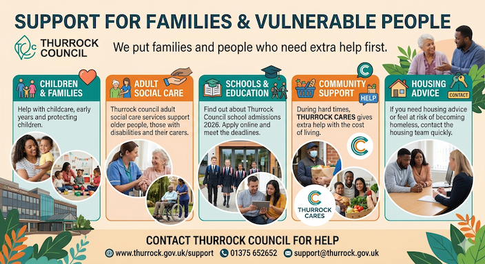 - Thurrock community support – During hard times, Thurrock Cares gives extra help with the cost of living.