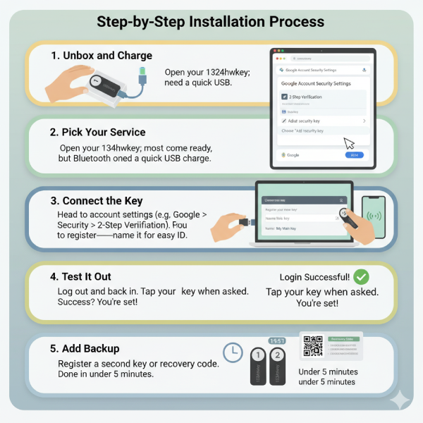 5. Add Backup: Register a second key or recovery code. Done in under 5 minutes.